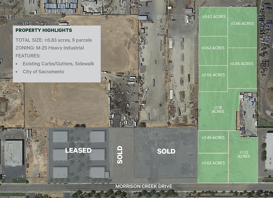 Build-to-suit opportunity with an existing curb, gutters & sidewalk. Location in the City of Sacramento. 9 parcels for sale or lease: