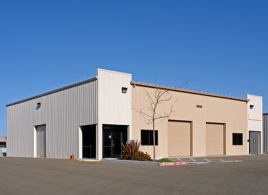 Insulated metal industrial warehouse building at 8630 Elder Creek Road in Sacramento, CA, located in Elder Creek Business Park. The warehouse at ±4,900 SF is for lease. It has 6 grade level doors and ±467 SF office. Includes an existing fire sprinkler system and free surface parking, and is zoned for industrial use. Monument signage available. Located off Fruitridge Road between Elder Creek Road and Florin Road, near Highway 99 and Highway 50 within the Power Inn industrial submarket.